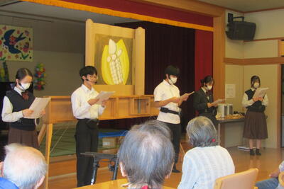 9月25日(木) 今年度2回目の訪問に伺いました。読み聞かせをし、一緒に体操したり、お菓子を食べながらお話をしました。読み聞かせでは、ボランティアに参加した5人のうち3人が、初めてデイサービスでの読みかせとなりました。デイサービス利用者の方との雑談では和気あいあいと話ができ、心打ち解けた時間でした。このボランティア活動は、いい経験として将来に活かせると思いました。